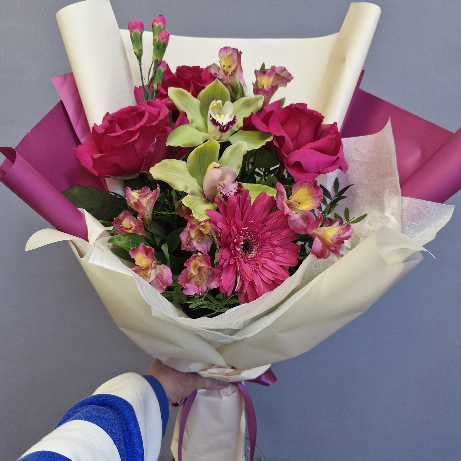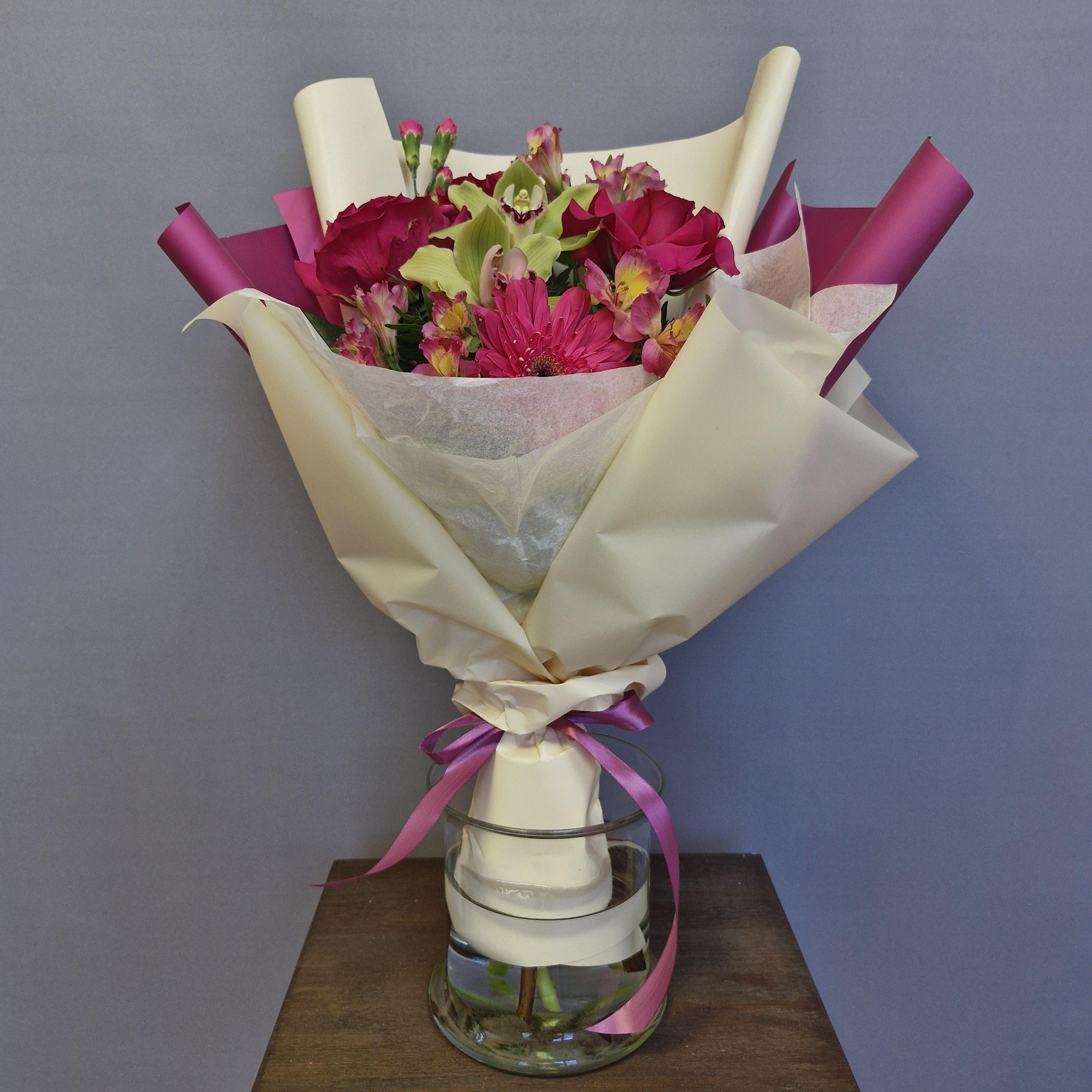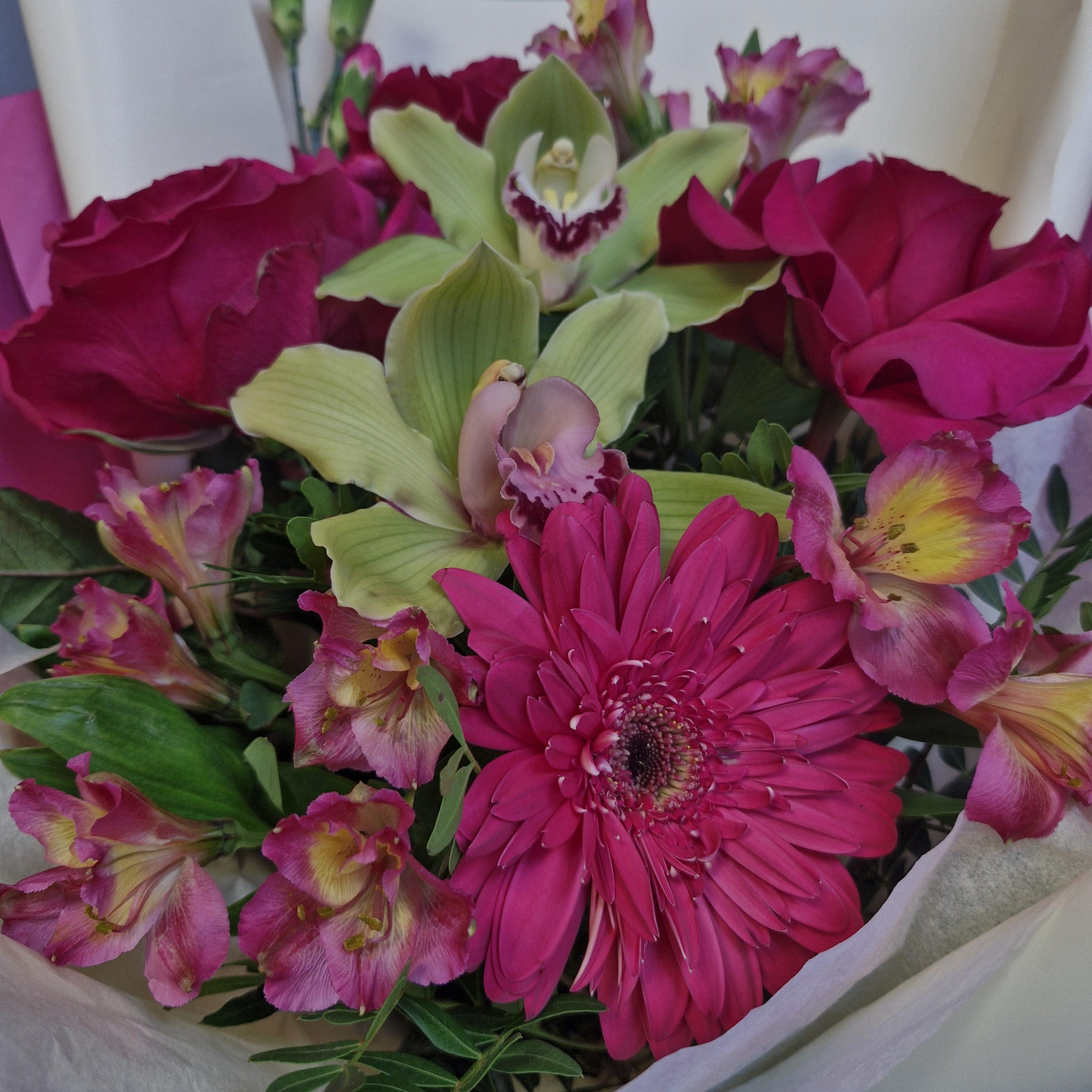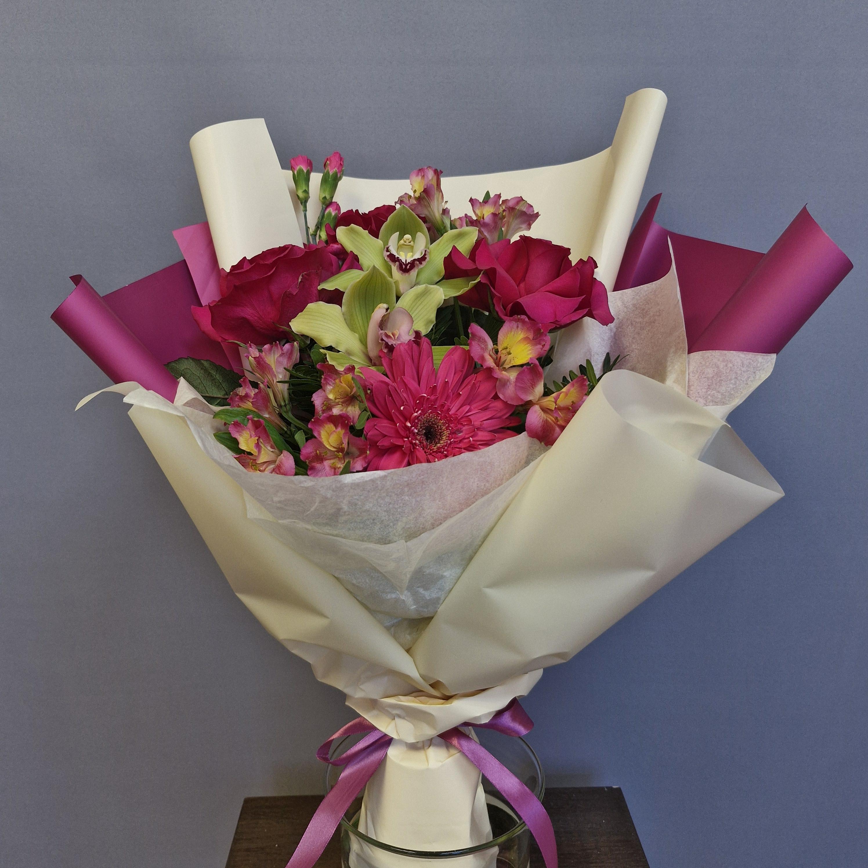 Солнечные **герберы** добавляют искру озорства и жизнерадостности, а редкие **зеленые орхидеи** – ноту экзотической элегантности и таинственности. Воздушная **альстромерия** привносит в букет легкость и очарование, а облако из нежного **кустового диантуса** подчеркивает его изысканность.