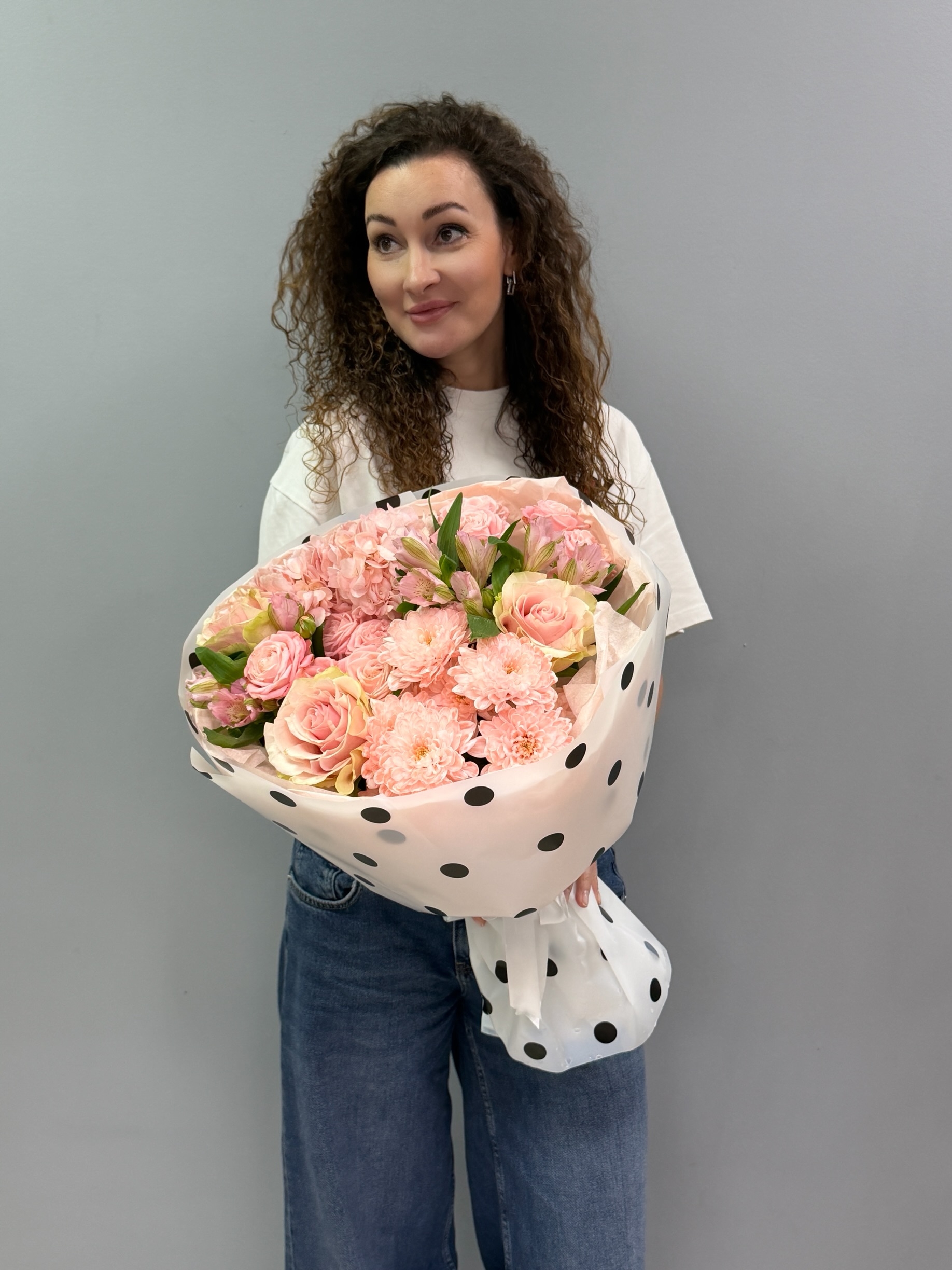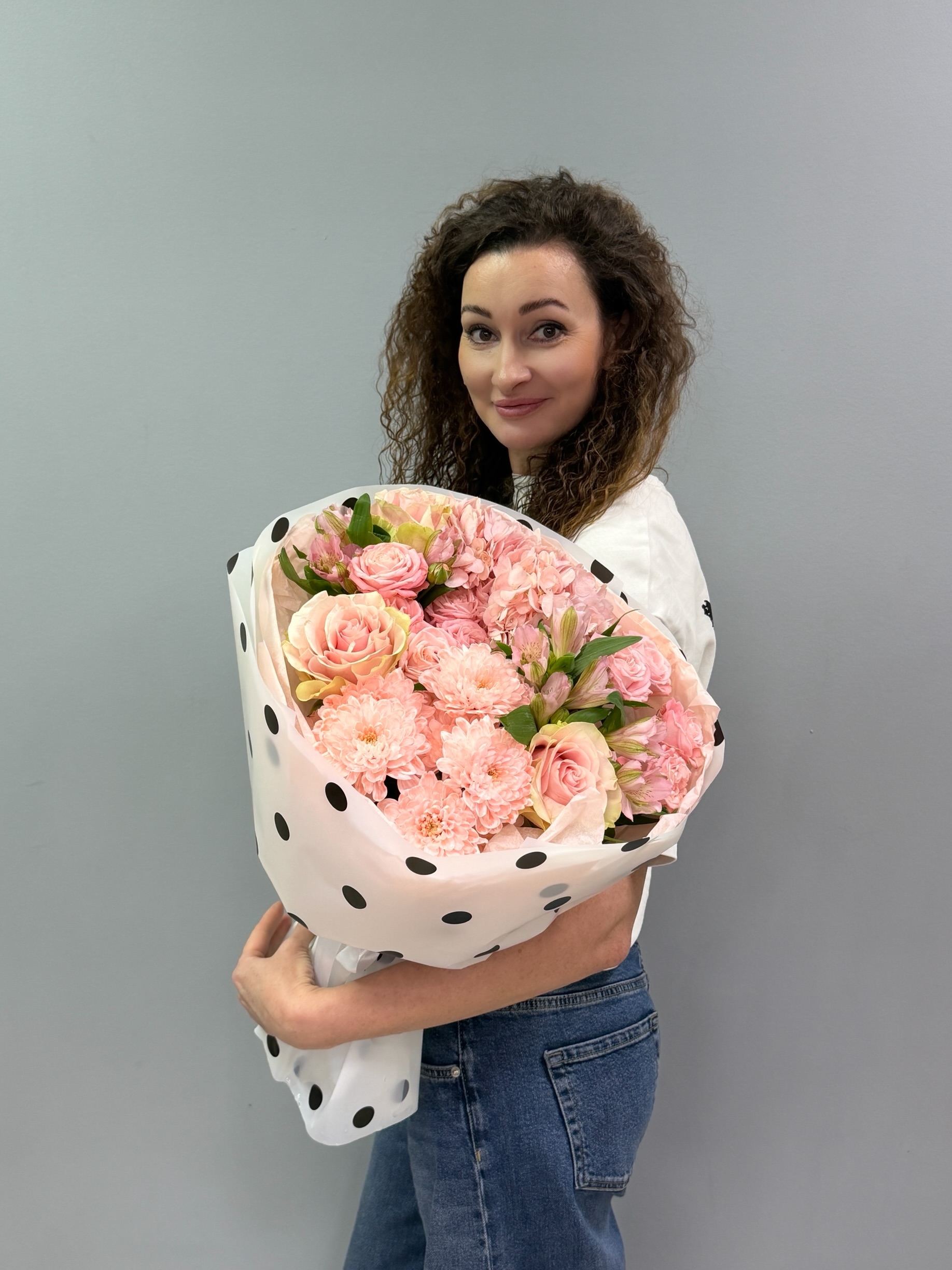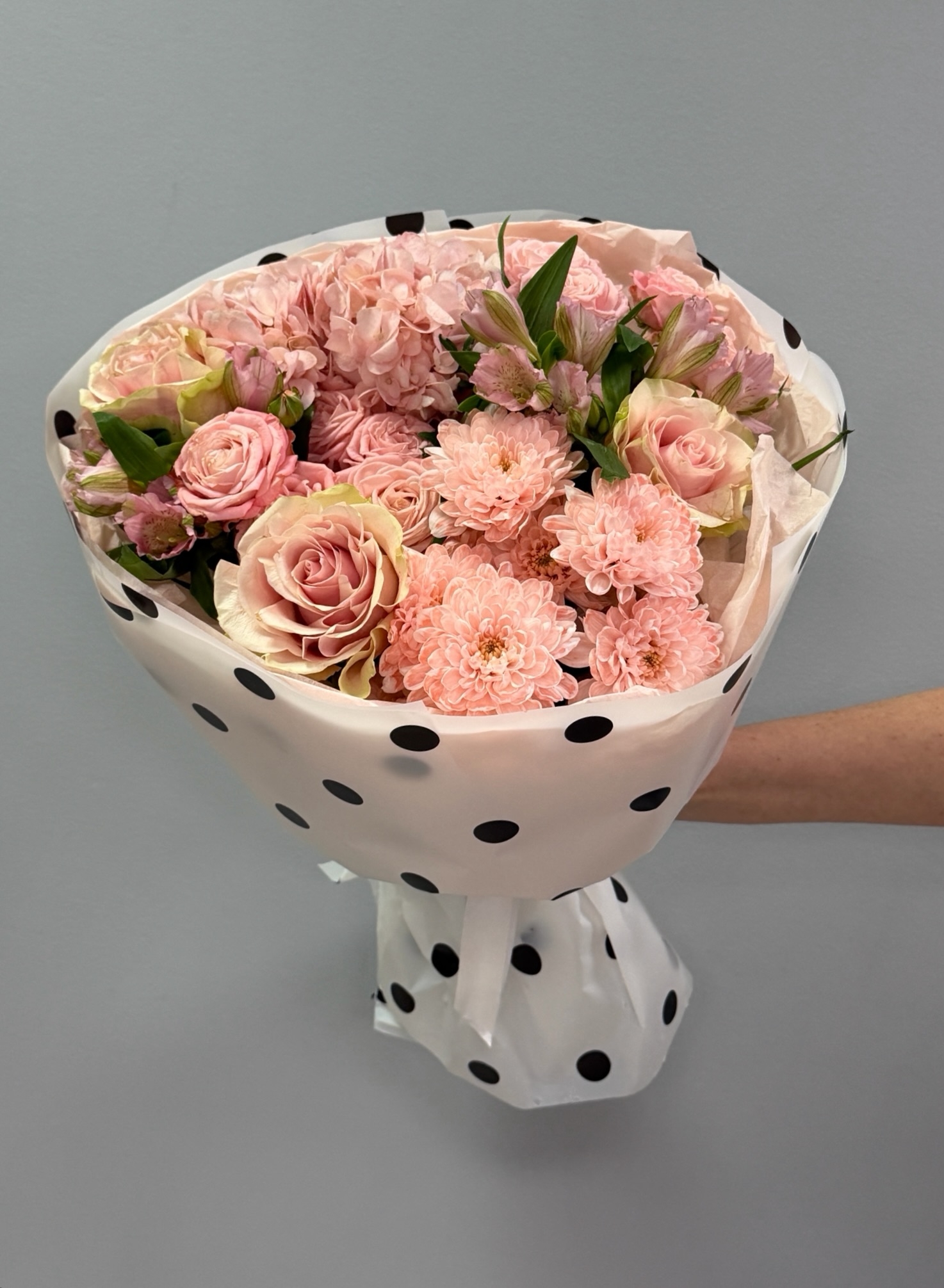 В его сердце расцветает нежная палитра розовых оттенков: воздушная гортензия, изящные розы и бархатистые хризантемы создают чарующую гармонию. Этот цветочный ансамбль, полный утонченности, эффектно контрастирует со стильной белой упаковкой, украшенной выразительным крупным черным горохом.