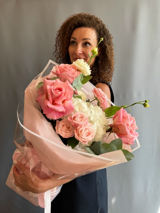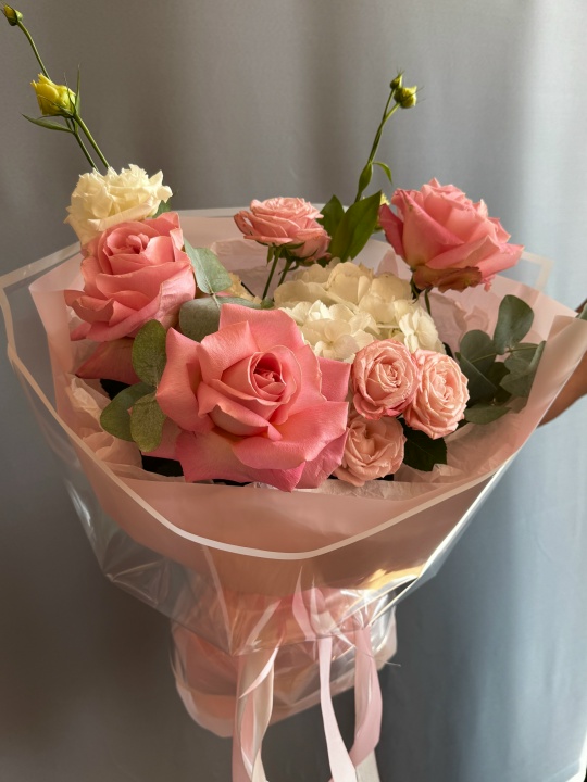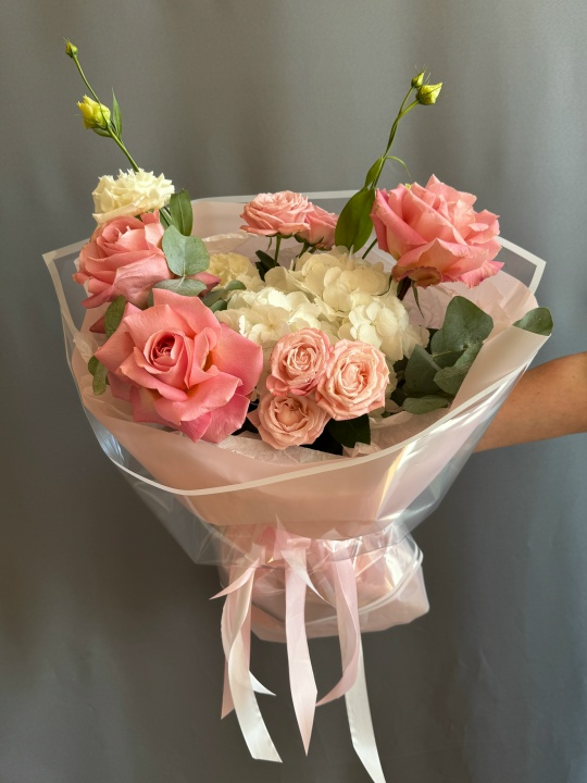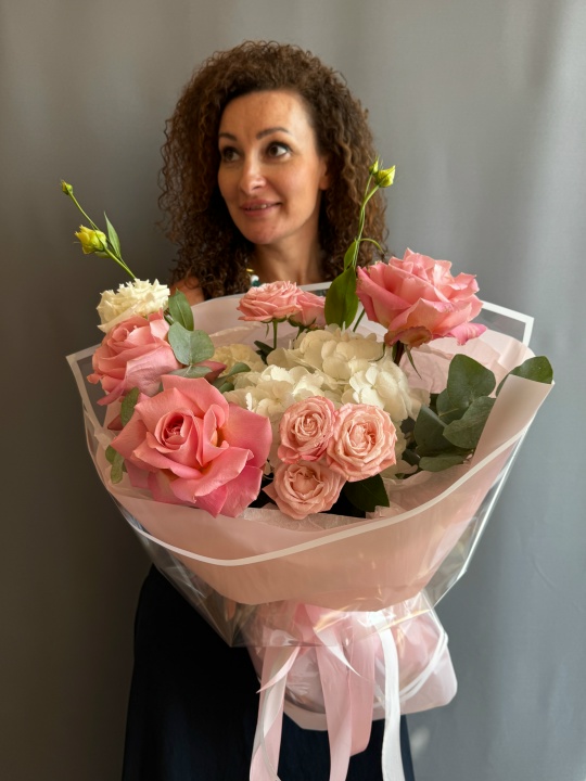 Состав: гортензия, эустома, кустовая пионовидная роза, французская роза