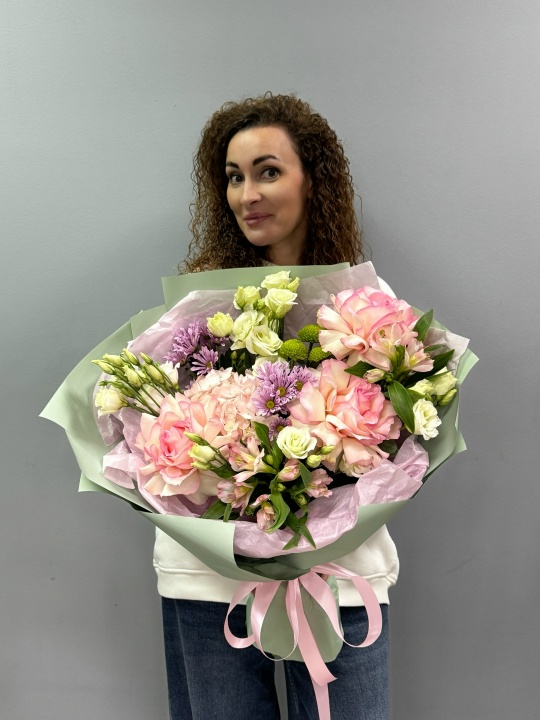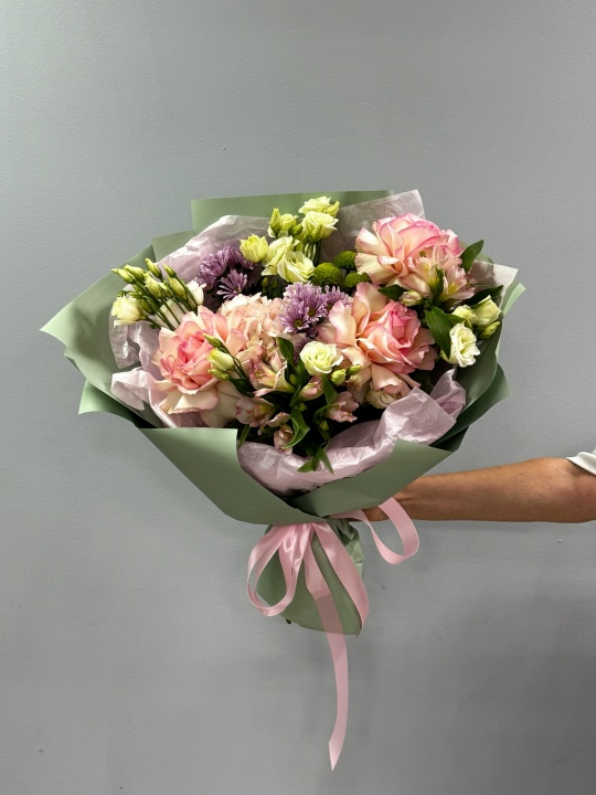 Состав: французские розы, эустома, альстромерия, хризантема