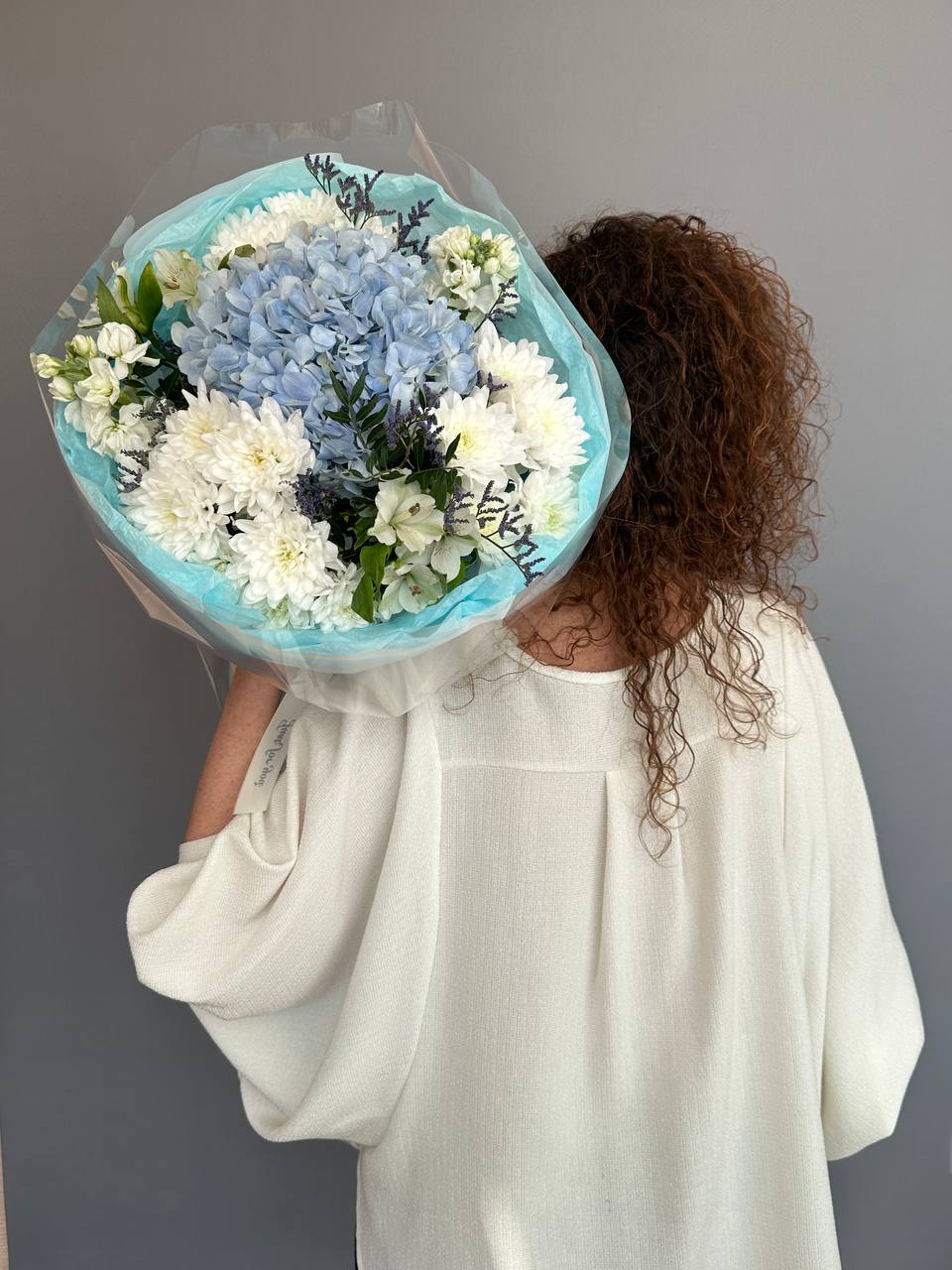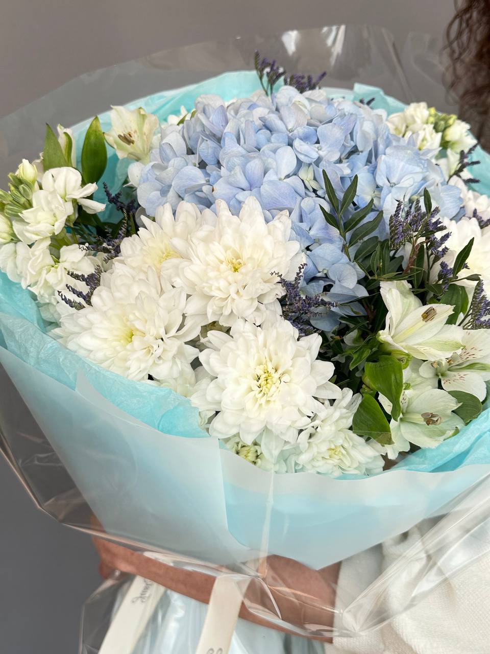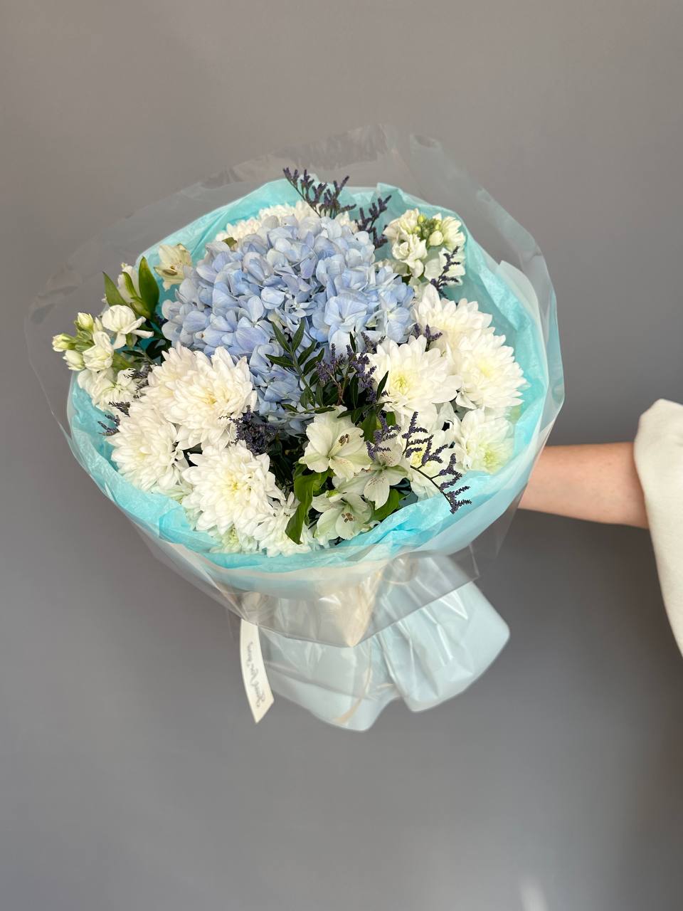 Невероятно эффективный букет из гортензии, лимониума, маттиолы, хризантемы