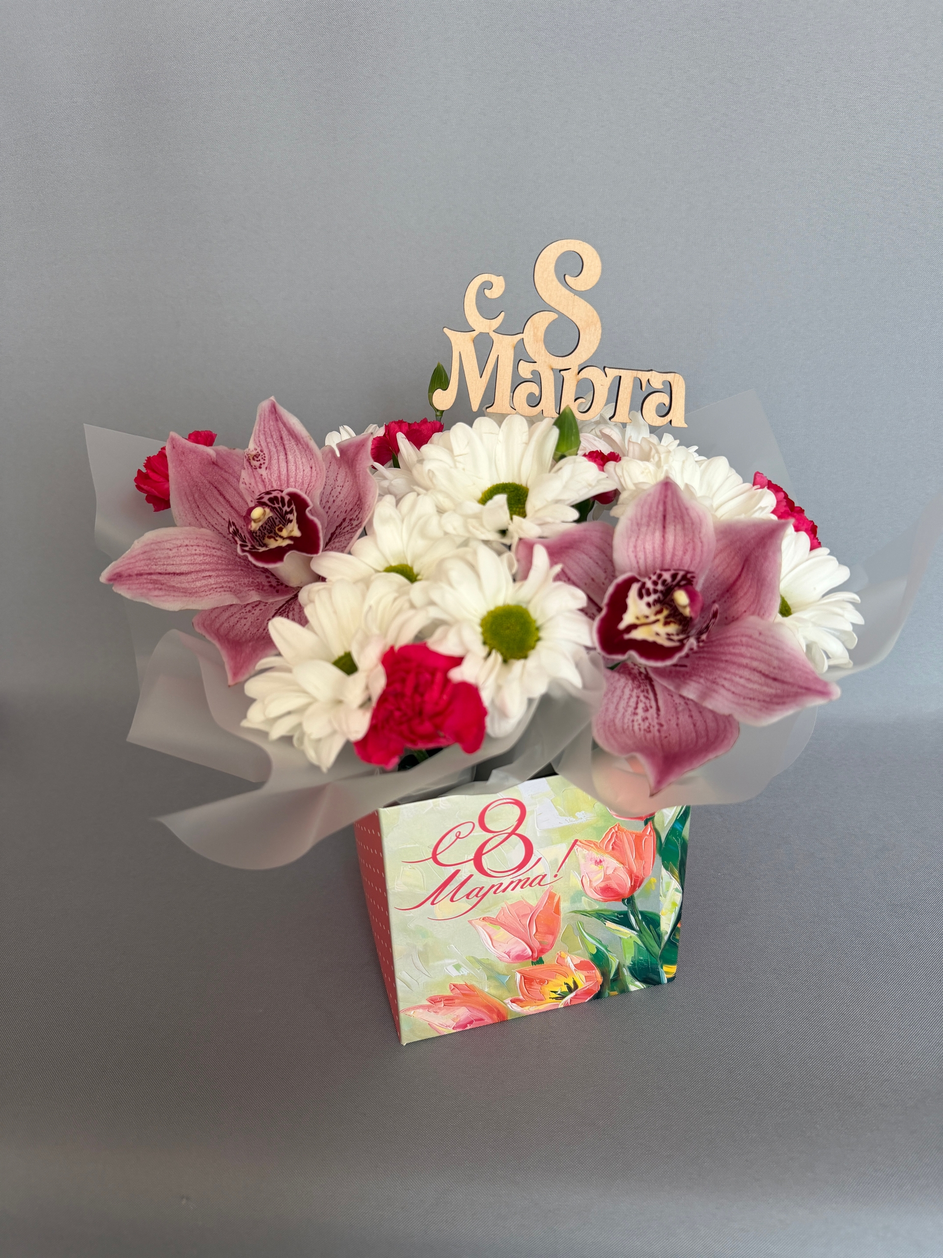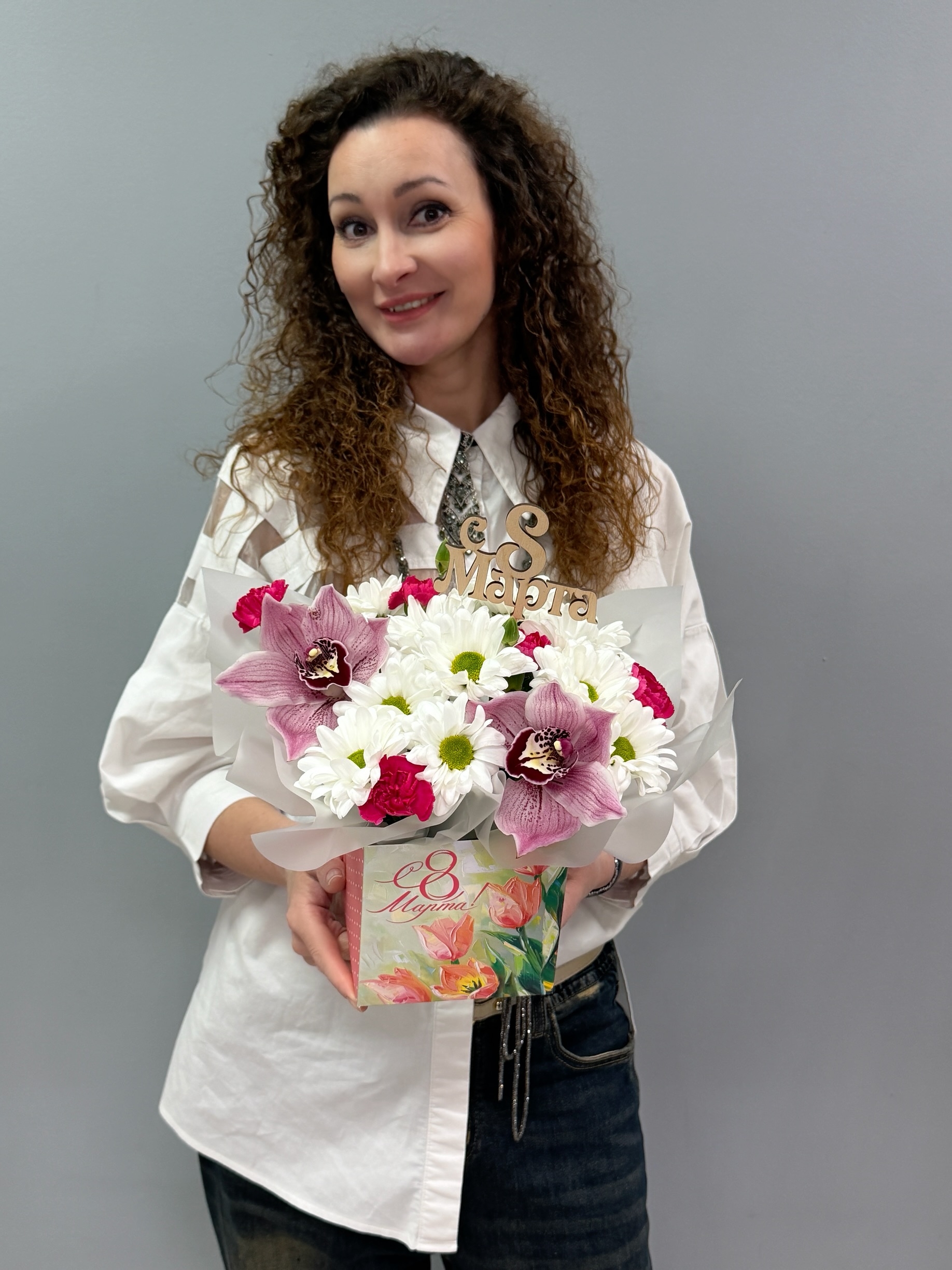 Элегантный дуэт цветов в тематическом оформлении — готовое решение для вашего поздравления. Утонченная орхидея и пышные соцветия хризантемы создают образ, полный очарования. Приятный бонус: праздничный топпер уже в комплекте. Прекрасный подарок для тех, кто вам дорог.