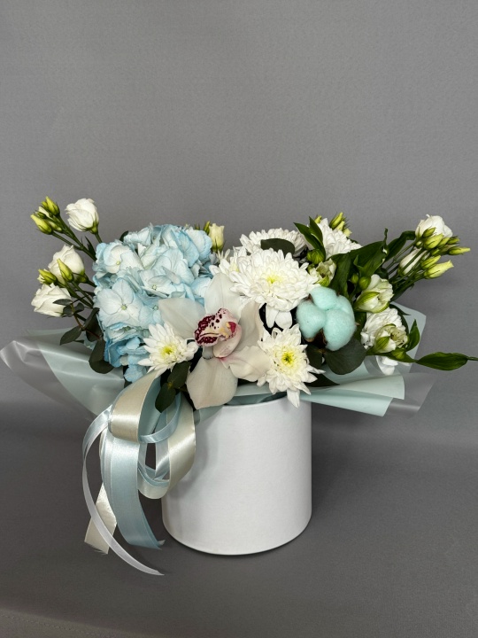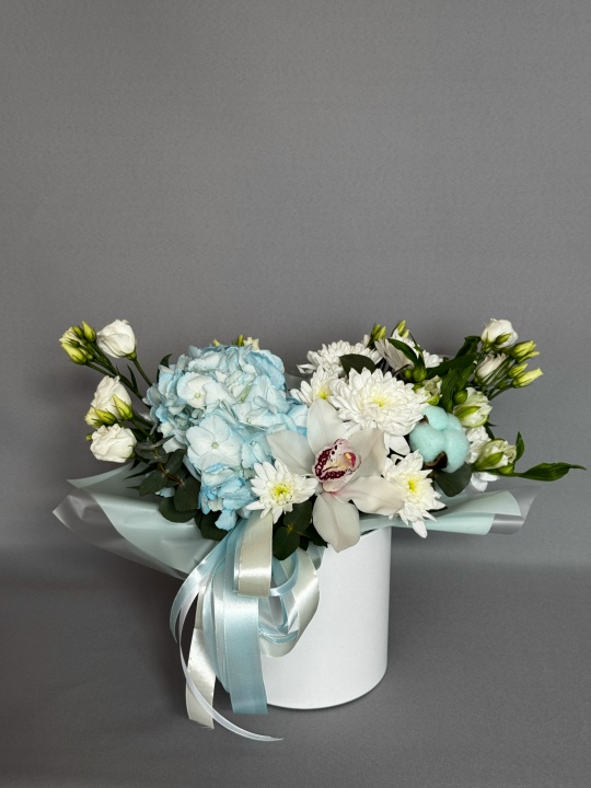Состав: гортензия, орхидея, эустома, кустовая хризантема, хлопок