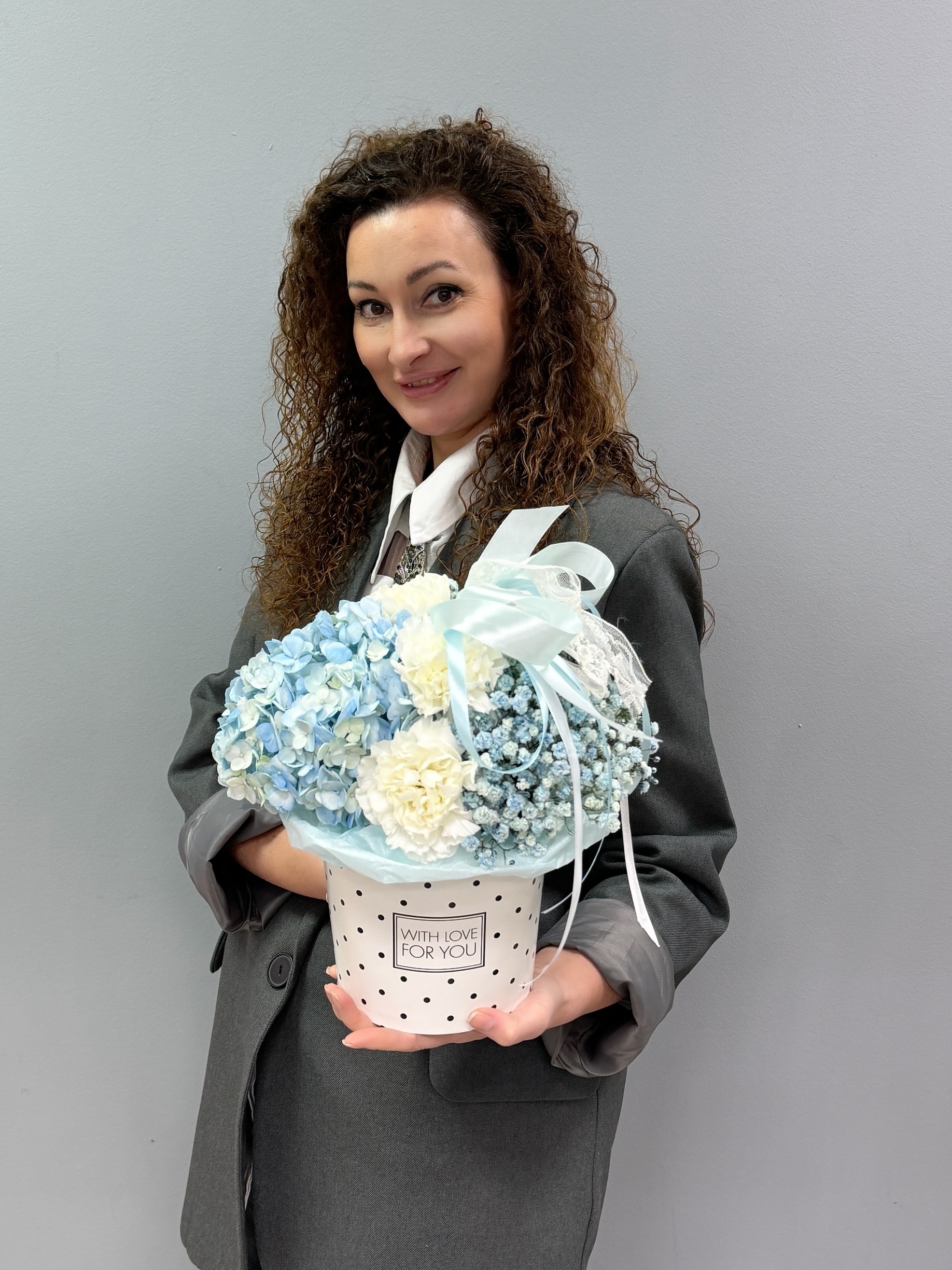 Эта композиция – настоящий праздник для глаз и сердца! Стильная коробка в виде стакана для попкорна, с трогательной надписью «With Love For You», уже сама по себе вызывает улыбку. А внутри – нежное облако из голубой гортензии и гипсофилы, дополненное воздушными белыми диантусами.