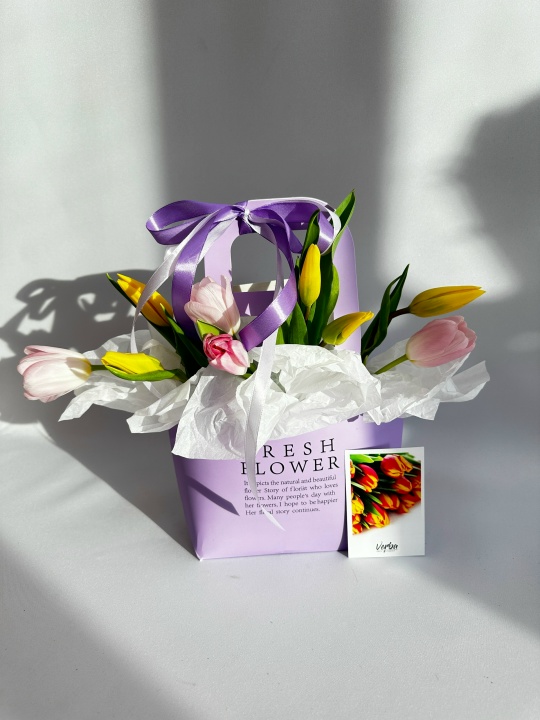 Букет из лимитированной коллекции к 8 марта. Стильная сумочка с 9 тюльпанами