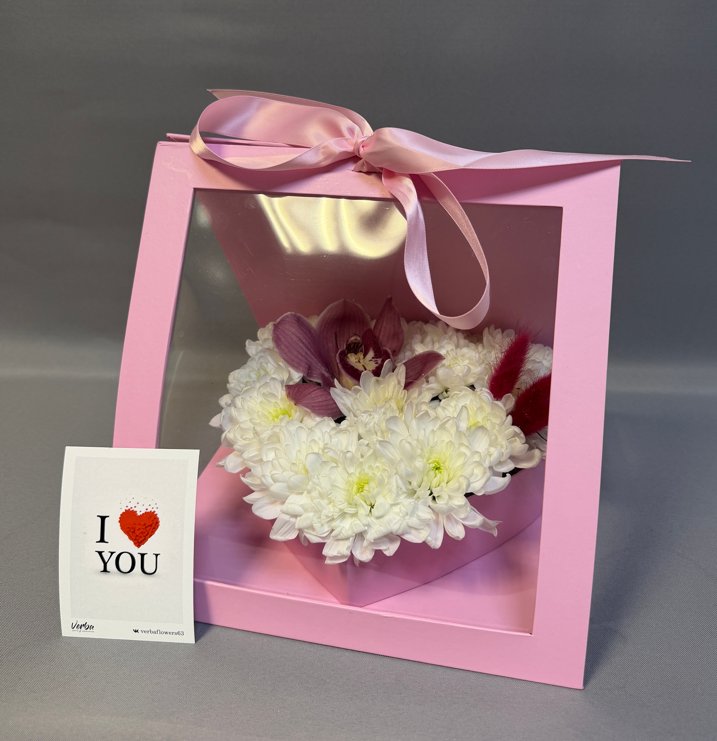 Сердце композиции — невероятно тактильная, бархатная хризантема, чья текстура напоминает мягкое прикосновение. Элегантная розовая орхидея добавляет образу утонченности и роскоши, а авторские детали в стильном тематическом боксе завершают этот безупречный ансамбль.